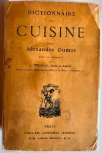 DUMAS (Alexandre) - Grand dictionnaire de cuisine. Paris, Alphonse Lemerre, 1873 ; in-8, IV-819 pp., broché. Un très grand livre de gastronomie par un des très grands écrivains du 19ème siècle. Un grand classique de la gastronomie française. En fin de volume des menus ainsi que des publicités pour des négociants en alcool et en mets fins. Etiquette de relieur de Bucarest et quelques tampons roumains. Exemplaire sans rousseurs et en bon état. Édition revue et complétée par J. Vuillemot, élève de Carême.