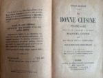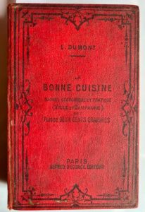 DUMONT (Émile) - La bonne cuisine française tout ce qui a rapport à la table. Manuel-guide pour la ville et la campagne plus de deux cents dessins spéciaux. Paris, Albert Degorce, Librairie Magnin, 1932 ; in-8, VIII-650 pp. + additif de 10 pp., cartonnage rouge imprimé de noir d'éditeur, dos lisse orné. Bel état.