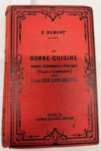 DUMONT (Émile) - La bonne cuisine française tout ce qui a rapport à la table. Manuel-guide pour la ville et la campagne plus de deux cent dessins spéciaux. Paris, Albert Degorce, Librairie Magnin, 1932 ; in-8, VIII-650 pp. + additif de 10 pp., cartonnage rouge imprimé de noir d'éditeur, dos lisse orné. Bel état.