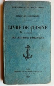 [INTENDANCE MARITIME] - SERVICE DES SUBSISTANCES. Livre de cuisine à l'usage des cuisiniers d'équipages. Paris, Imprimerie Berger-Levrault, 1937 ; in-12, 233 pp., reliure pleine toile d'éditeur.