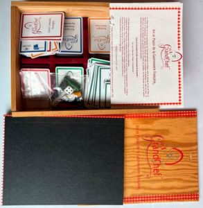 [JEU DE SOCIÉTÉ] - FRANCE (Benoit de l'académie des gastronomes) - Le grand chef. Art et plaisir de la gastronomie française. Nantes, Éditions Tandem et Éditions Benoit France, vers 1990 ; in-4, un plateau représentant la France, des cartes, un dé et six pions, dans une boite en bois imitant une boite qui contiendrait 3 bouteilles. Jeu de société où il faut répondre à des questions sur la gastronomie et les spécialités françaises.