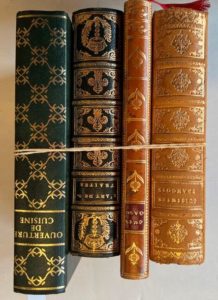 [LOT DE 4 LIVRES DE GASTRONOMIE RÉIMPRESSIONS]. DE LA VARENNE - Le vray cuisinier françois… Réimpression de 1976. Le cuisinier gascon. Réimpression de 1970. L.S.R. - L'art de bien traiter. Réimpression de 1978, tirée à 250 exemplaires numérotés. LANCELOT DE CASTEAU - Ouverture de cuisine. Réimprssion de 1983. Reliures fac-similés de reliures anciennes.