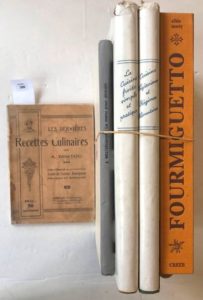 [LOT DE 5 LIVRES DE GASTRONOMIE]. WESTERMANN - Le menu pour demain. Éditions du Rhin, cartonnage, vers 1950. PELLAPRAT - La cuisine froide simple et pratique. Comptoir du Livre, 1949. PELLAPRAT - Manuel de la cuisine végétarienne. Comptoir du Livre, 1949. MARTY - Fourmiguetto, souvenirs, contes et recettes du Languedoc. Éditions Créer, 1978, cartonnage d'éditeur. BONTOU - Les dernières recettes culinaires. Counouilhou, 1914, broché.