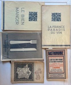 [LOT DE 5 LIVRES DE GASTRONOMIE]. CURNONSKY - La France paradis du vin. Passiflorine, 1931, broché. Le bien mangé, Passiflorine, 1931, broché. Fines recettes des vieilles provinces de France. broché tenu par une ficelle, vers 1930. CURNONSKY & DERYS - Souvenirs de table Parisiennes II. Passiflorine, vers 1930, broché. BOBINET - Gastronomie, un des secrets du bonheur. L'art du bien boire et du bien manger. Chez l'auteur, 1949, broché.