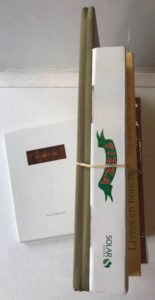 [LOT DE 5 LIVRES DE GASTRONOMIE]. COLLECTIF - Pizza. Livres de 30 recettes avec 1 roulette à découper les pizzas. Solar, vers 2000, maquette de boite à pizza. CATALOGUE D'EXPOSITION - Livres en bouche. BNF, Hermann, 2001, broché. GUÉRARD - Le jeu de l'oie et du canard. Cairn, 1998, en feuilles dans une chemise à lacets. MONTAGNÉ - Le trésor de la cuisine du bassin méditerranéen par 70 médecins de France. Zizine, vers 1940, broché, illustré par Valentin Le Campion. DUCASSE - Le Louis XV. Monaco, vers 2000, en feuilles dans un emboitage.