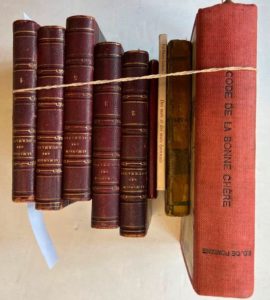 [LOT DE 5 LIVRES DE GASTRONOMIE]. PONIANE (Édouard) - La cuisine en plein air. Zizine, 1935, cartonnage d'éditeur. Code de la bonne chère. Albin-Michel, vers 1940, reliure originale d'amateur. GRISON - Des mets et des mots lyonnais, Xavier Lejeune, 1999, broché. GAYDOU (Mami) - La cuisine française. Jac, 1941, cartonnage d'éditeur. ANONYME - Almanach des gourmands. 1804, volume 1, 2, 3, 5 et 6, reliures fin 19ème siècle. Les 5 volumes.