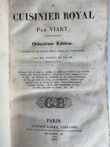 VIART (Homme de bouche) - Le cuisinier royal. Paris, Gustave Barba, 1837 ; in-4, IV-616 pp., reliure demi-veau vert bouteille, dos lisse orné, tranches peintes. 18ème édition augmentée de douze cents articles nouveaux par MM. Fouret et Délan. Ex-libris P.J.C. Orsi, cuisinier, meilleur ouvrier de France.