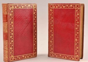 GRESSET Jean-Baptiste GRESSET Jean-Baptiste RELIURE DE BOZÉRIAN LE JEUNE Œuvres Paris, Renouard, 1810-11, 3 tomes en 2 vol. In-8°. Plein maroquin rouge à longs grains (« Rel. F. Bozérian Jeune » en lettres dorées au bas du dos du tome 1). Dos lisse richement orné de motifs floraux au pointillé avec titre et tomaison en lettres dorées. Plats décorés d’un encadrement de filets dorés et d’une guirlande de pampres et de raisins dorés. Dentelle à la grecque dorée aux contreplats. Coiffes et coupes guillochées. Toutes tranches dorées. Dos insolés, frott. aux mors. Rousseurs pâles, principalement aux gravures. Édition soignée, ornée d’un portrait de l’auteur et de 8 jolies figures ht gravées d’après Moreau le Jeune. La p. de titre du poème « Le Parrain magnifique », placé en fin du tome 2, est datée de 1810. Provenance : Bibliothèque E. J. Gallichan (ex-libris)