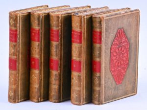 LANGLÈS Mathieu LANGLÈS Mathieu REHAUSSÉE DE COLORIS D’ÉPOQUE Collection portative de voyages traduits de différentes langues orientales et européennes Réunion complète en 5 tomes : - Voyage de l’Inde à la Mekke, par A’bdoûl‑Kérym, favori de Tahmas‑Qouly‑Khân, extrait et traduit de la version anglaise de ses mémoires, avec des notes géographiques, littéraires etc. par L. Langlès, Conservateur des Mss. Orient. de la Bibliothèque nationale Paris, de l’imprimerie de Crapelet, An V, 1797, XXXII‑246 pp., front. et 1 pl. - Voyages de la Perse dans l’Inde et du Bengal en Perse avec une notice sur les Révolutions de la Perse, un mémoire historique sur Persepolis..., Paris, de de l’imprimerie de Crapelet, An VI, 2 vol., CXXXI‑142 pp., front. ; (2)ff., 268 pp., front. - Voyage pittoresque de l’Inde fait dans les années 1780‑1783 par M. William Hodges Paris, de l’imprimerie de Delance, An XIII, 1805, 2 vol., (1)f., XXVII‑222 pp., front. et 11 pl. dont 1 dépliante ; (1)f., 252 pp., 4 pl. Plein veau vert d’époque. Dos lisse orné de fleurons dorés. Pièces de titre et de tomaison en maroquin rouge. Plats décorés d’un large médaillon octogonal orné à froid de veau rouge orangé, d’une roulette à froid et d’un double filet doré. Filet doré courant sur les coupes. Toutes tranches dorées. Frott. aux mors, coiffes et coins sans excès, dos éclaircis. Ce très bel ensemble est illustré de 20 planches, toutes mises en couleurs à l’époque. Charmante et peu commune édition dans une rare reliure strictement d’époque.