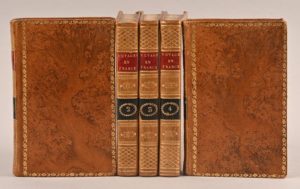 Voyages en France et autres pays, en prose et en vers [VOYAGES] REHAUSSÉE DE COLORIS D’ÉPOQUE Voyages en France et autres pays, en prose et en vers Paris, Chez Briand, Libraire, 1818, 5 tomes In-16°. Plein veau raciné glacé d’époque. Dos lisse orné de fleurons et de croisillons dorés. Pièce de titre de maroquin rouge et pièce de tomaison de maroquin noir. Roulette dorée entourant les plats. Tranches marbrées. Intérieur très frais. Bas du dos du tome 5 fendu. « Troisième édition augmentée ». Textes par Racine, La Fontaine, Regnard, Chapelle et Bachaumont, Hamilton, Voltaire, Piron, Gresset, Fléchier, … Illustrée de 36 planches ravissantes, toutes mises en couleurs à l’époque. Bel exemplaire.