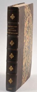 BAUDELAIRE Charles BAUDELAIRE Charles 1/30 SUR HOLLANDE Oeuvres posthumes et Correspondances inédites Paris, Quantin, 1887. Grand in-8°. Demi-maroquin chocolat à coins (Magnin). Dos à 5 nerfs orné de caissons estampés à froid entourant un bouquet de fleurs dorées. Auteur et titre dorés. Couv. cons. Complet du portrait en frontispice et du fac-similé dépliant. Coins inférieurs un peu écrasés et début de fente en haut des mors. Édition précédée d’une étude biographique par Eugène Crépet, en partie originale pour les Journaux intimes : Fusées, mon cœur mis à nu. 1/30 sur Hollande, seul grand papier.