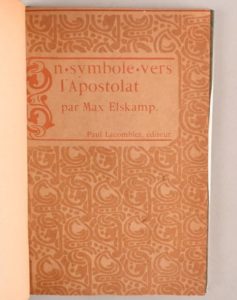 ELSKAMP Max ELSKAMP Max EXEMPLAIRE DE PAUL ÉLUARD En symbole vers l’apostolat Bruxelles, Lacomblez, 1895 In-8°. Plein papier marbré. Dos orné d’une pièce de maroquin noir avec auteur et titre en lettres dorées. Tête dorée. Couv. cons. Rousseurs pâles éparses. Décharges des couv. sur le faux-titre et la dernière page de garde (bruniss.) Édition originale. 1/200 exemplaires sur Hollande, après 2 Chine et 5 Japon. Ornementation de la couverture par Henry van de Velde. Envoi autographe signé au faux-titre de l’auteur au poète Francis Vielé-Griffin : « À Francis Vielé Griffin, humblement. Max Elskamp ». Provenance : Bibliothèque Paul Éluard (ex-libris dessiné par Max Ernst : « Après moi le sommeil »)