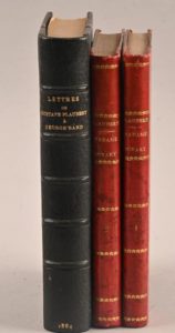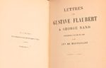 [FLAUBERT Gustave] [FLAUBERT Gustave] 1/10 DE TÊTE SUR JAPON Lettres de Gustave Flaubert à George Sand, précédées d’une étude de Guy de Maupassant Paris, Charpentier et cie, 1884 In-12°. Demi-maroquin bleu gris à coins d’époque. Dos à 5 nerfs avec titre et date en lettres dorées. Tête dorée. Couv. et dos (défauts, 4e de couv. presque déreliée) cons. Intérieur très frais. Édition originale. 1/10 exemplaires de tête sur Japon. Importante étude de Maupassant consacrée à son maître et ami Gustave Flaubert. On joint : FLAUBERT Gustave Madame Bovary. Moeurs de Province Paris, Michel Lévy frères, 1857, 2 tomes In-12°. Demi-chagrin rouge d’époque. Dos lisse orné de guirlandes dorées avec auteur, titre et tomaison en lettres dorées. Frott. et saliss. Reliure modeste. Rousseurs éparses. Édition originale de ce chef-d’œuvre de la littérature mondiale. Du 2e tirage avec les fautes corrigées comme celle de « Senart » devenu « Senard ».