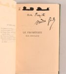 GIDE André GIDE André RELIURE DE PAUL BONET Le Prométhée mal enchaîné Paris, Mercure de France, 1899 Petit in-12°. Plein maroquin mosaïqué vert sombre (Paul Bonet). Dos lisse orné d’un semis de petites perles d’or avec auteur, titre et date au palladium. 1er plat orné du même semis de petites perles d’or dont l’espacement entre elles se réduit à mesure que le regard se rapproche de la bordure; au centre, décor abstrait et répété de haut en bas au palladium ainsi que de très fines perles au palladium. 4e plat décoré du même semis de petites perles d’or espacées. Chacune des doublures de même maroquin bord à bord est décorée pareillement à leur plat respectif dans un jeu de miroir saisissant. Gardes de même maroquin orné du même semis de petites perles d’or. Doubles gardes de papier marbré. Toutes tranches dorées. Couv. et dos cons. de grande fraîcheur. Chemise de même maroquin avec auteur, titre et date au palladium (dos insolé) et étui bordé de même (insolé, petits frott.). Intérieur parfait. Édition originale. 1/12 exemplaires de tête sur Hollande (n°2). Avec envoi autographe signé de l’auteur : « À [prénom et nom raturés] son Ermite. André Gide » Provenance : Bibliothèque Raoul Simonson (ex-libris) Superbe et rare exemplaire habillé d’une très élégante reliure Art Déco conçue par Paul Bonet ! Réf. : Bonet, « Carnets », n°225 (reliure de Desmules en janvier 1933 – dorure de Jeanne en février 1933). Reliure présentée au Salon des Arts Décoratifs de 1933 (voir planche 167)