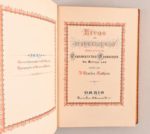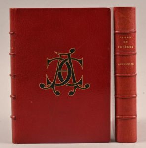 MATHIEU Charles MATHIEU Charles RELIURES DE CHAMBOLLE-DURU – MARIUS-MICHEL DOREUR Livre de prières illustré à l'aide des ornements des manuscrits du Moyen-Âge. Paris, sn, 1858-1862, 2 vol. In-12°. 1er volume : plein maroquin bordeaux (Chambolle-Duru – Marius Michel [père] doreur), dos à 5 nerfs avec titre en lettres dorées. Plats ornés du chiffre A et double C croisé mosaïqué de maroquin noir bordé d’un filet doré. Doublures de maroquin vert somptueusement ornées d’un décor « à la fanfare » et bordées de maroquin bordeaux décoré d’une roulette dorée. Coiffes guillochées. Filet doré courant sur les coupes. Toutes tranches dorées. Dos éclairci, petites griffures et frott. çà et là sans excès. Second volume (« Notice historique et texte explicatif par Ferdinand Denis ») : plein maroquin bordeaux (Chambolle-Duru), dos à 5 nerfs avec titre et le mot « Appendice » en lettres dorées. Contreplats bordés de maroquin bordeaux décoré d’une large dentelle dorée. Coiffes guillochées. Filet doré courant sur les coupes. Toutes tranches dorées. Dos éclairci, petites griffures et frott. çà et là sans excès. Splendides chromolithographies de Charles Mathieu. Figures ht et bordures d'après des ornements byzantins, carolingiens, saxons, allemands, français, gothiques du IXe au XIIe siècle. Très bel exemplaire parfaitement établi par des maîtres de la reliure et de la dorure.