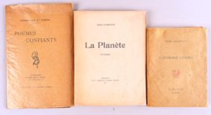 VANDEPUTTE Henri VANDEPUTTE Henri 3 éditions originales, à savoir : - L’Homme jeune Bruxelles, Le Coq rouge, 1896 In-16°, broché. Manques au dos et aux coins des couv. Brochage cassé au milieu de l’exemplaire. Édition originale peu commune (souvent tirée à 60 ex. chez cet éditeur). Avec signature de l’auteur (dédicataire découpé). - Poèmes confiants Bruxelles, Georges Balat, 1898 In-8°, broché. Édition originale peu commune sur beau papier vergé (tirage inconnu). - La Planète, Bruxelles, Veuve Ferdinand Larcier, 1901 In-12°, broché (manque au dos, en-tête du faux-titre découpé et 1er cahier presque débroché). Édition originale peu commune. 1/300 sur vélin.