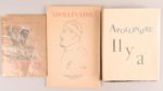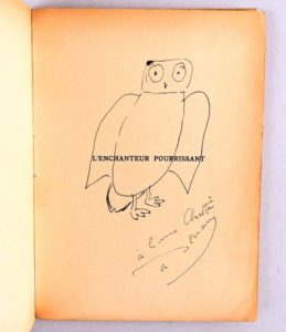 APOLLINAIRE Guillaume – [DERAIN André] APOLLINAIRE Guillaume – [DERAIN André] DESSIN ORIGINAL DE DERAIN L’Enchanteur pourrissant Paris, NRF, 1921 In-12°, broché. Couv. en partie décoll. des cahiers et mors de la 1ère de couv. fendu. Nouvelle édition illustrée de reproductions de bois gravés pour l’édition originale par André Derain (la 1ère édition publiée en 1909 chez Kahnweiller). Exemplaire sur papier d’édition lég. bruni en marge. Au faux-titre, dessin original d’André Derain représentant un hibou (référence au personnage-hibou dans le texte d’Apollinaire) et envoi autographe signé du même : « à l’ami Chatte. A. Derain ». On joint du ou sur le même : - Il y a Paris, Éditions Grégoire, 1947 In-8° carré, broché. Étui illustré d’éditeur Édition illustrée par Edouard Goerg dont 2 lithographies originales (portrait du poète en frontispice et l'illustration de l'emboîtage, imprimées par Mourlot), 6 culs-de-lampe gravés sur bois tirées par Armanelli et des dessins au lavis. Avec la reproduction à pleine-page d'un dessin d'Apollinaire intitulé « Minuit ». 1/1250 sur vélin parcheminé. Bel exemplaire. - Revue L’Esprit Nouveau Apollinaire Paris, Éditions de l’Esprit Nouveau, Librairie Jean Budry et cie, sd [1924] In-8°. Petite coupure à la 1ère de couv., sinon bel exemplaire Numéro spécial (et dernier de la revue) consacré à Guillaume Apollinaire. Couverture illustrée d’un dessin de Picasso. Avec des illustrations et photographies in-texte et à pleine page, dont une lithographie originale à la sanguine de Marcoussis (Portrait d'Apollinaire ). On y trouve également « La Plante » en fac-similé du conte inédit d’Apollinaire mais aussi des regards sur Guillaume Apollinaire par Roch Grey, André Salmon, Paul Dermée, Pierre Albert-Birot, Henri Hertz, Ivan Goll, Alberto Savinio, etc.