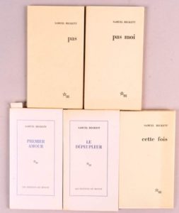 BECKETT Samuel BECKETT Samuel Réunion de 5 éditions originales sur grand papier. Tous les exemplaires sont brochés et non coupés. - Premier amour Paris, Minuit, 1970 1/92 ex. marqués « 92 » sur bouffant sélect réservés à la librairie des éditions de Minuit. - Le Dépeupleur Paris, Minuit, 1970 1/201 exemplaires sur bouffant sélect. - Pas moi Paris, Minuit, 1975 1/150 sur vélin d’Arches, seul grand papier mis dans le commerce - Pas Paris, Minuit, 1977 1/100 sur vélin d’Arches, seul grand papier - Cette fois Paris, Minuit, 1978 1/100 sur vélin d’Arches, seul grand papier