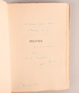 BOSCO Henri BOSCO Henri Réunion de 4 éditions originales, 2 avec envoi autographe signé, à savoir : - Irénée Paris, NRF, 1928 In-4°, broché. Dos passé. Édition originale. 1/109 exemplaires réimposés (exemplaire nominatif pour Jacques Lion, n°XII). Envoi autographe signé à l’encre vert émeraude au faux-titre à Georges Kelner : « Pour Monsieur Georges Kelner. Ici danse [Irénée] dans les îles. Elle a existé. Où est-elle ? Au royaume des rêves ? Henri Bosco ». - L’Enfant et la Rivière Alger, Charlot, 1945 In-4°. Cartonnage illust. d’éditeur. Édition originale peu commune de ce conte pour enfants. Illustrations d’Eliane Jalabert-Edon composées de 5 têtes de chapitre en noir et de 4 planches H.T. en couleurs, imprimées sur papier couché. - Sylvius Paris, Gallimard, NRF, 1948 Grand in-8° en ff. sous chemise imp. d’éditeur. Décharge du frontispice sur la p. de titre. Édition originale illustrée par Galanis dont un frontispice en pleine page et 13 en-têtes gravés en noir. 1/80 exemplaires de tête sur grand vélin Montval, accompagnés d’une épreuve libre du frontispice justifiée au crayon (62/80). Envoi autographe signé à l’encre vert émeraude au faux-titre à Georges Kelner : « À Monsieur Georges Kelner, l’homme de ce [Sylvius] qu’il a pu rejoindre à Paris. Avec la sympathie d’Henri Bosco ». - même titre et même édition Ex. broché. Décharge du frontispice sur la p. de titre. 1/1530 exemplaires sur vélin Marais Crèvecoeur