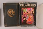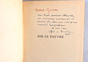 BOSSCHÈRE Jean de BOSSCHÈRE Jean de Job le Pauvre Paris, Jacques Povolozky & Cie, 1922 In-8°. Cartonnage noir d’éditeur (un peu poussièr.) avec pièce de titre imprimé au dos. Édition originale bilingue français/anglais, illustrée de 14 illustrations de l'auteur en pleine page imprimées sur papier fort de couleurs différentes. 1/450 exemplaires. Portrait de l'auteur par Wyndham Lewis en frontispice. Envoi autographe signé de l’auteur à Robert Guiette au faux-titre : « Robert Guiette [en rouge] dans leurs premiers vêtements, ces anciennes saisons, qui ne peuvent plus être pour vous qu’une curiosité typographique. De tout cœur. Jean de Bosschère 1948 [texte en bleu]». Est encarté un bifeuillet in-16° d’invitation à l’exposition de Jean de Bosschère à la Galerie « L’Époque » [c. 1925-30] à Bruxelles avec texte de Paul Fierens et illustration en noir de l’artiste en 1ère de couv. On joint illustrés par le même : - The Love Books of Ovid London, John Lane The Bodley Head, 1925 Grand in-8°. Pleine percaline bleu roi d’éditeur avec jaquette illustrée (petit défaut en coiffe supérieure de la jaquette). Intérieur très frais. Jolie édition illustrée de 24 ht dont 16 en couleurs ainsi que des dessins en noir dans le texte. Tirage limité à 3000 exemplaires imprimés sur beau papier vergé. - Giovanni Boccacio The Decameron New-York, Garden City Publishing Company, 1930 In-8°. Pleine percaline noir d’éditeur avec jaquette illustrée abîmée et renforcée au papier collant. Ex-donos en p. de garde. Illustrations en couleurs de Jean de Bosschère.