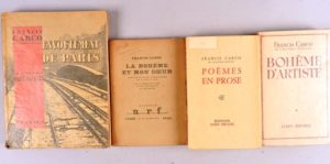 CARCO Francis CARCO Francis La Bohème et mon Cœur Paris, NRF, 1922 In-12°, broché. Édition originale tirée à 525 exemplaires, tous sur Arches (n°305). Portrait-frontispice de l’auteur à l’eau-forte par Galanis. On joint du même : - Envoûtement de Paris Paris, Grasset, 1938 In-8°, broché. Couv. ill. Coiffes abîmées et dos décoll. Ouvrage sur Paris illustré de 112 photos de René-Jacques en héliogravure. Édition originale tirée à 108 exemplaires num. ; ici, 1/23 sur Arches, 2e grand papier après 20 Madagascar. - Bohème d’artiste Paris, Albin Michel, 1940 In-12°, broché. Non coupé. Édition originale. Ex. sur alfa. - Poèmes en prose Paris, Albin Michel, 1958 In-12°, broché. Non coupé. Édition originale. 1/50 sur Arches, seul grand papier.