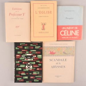 CÉLINE Louis-Ferdinand CÉLINE Louis-Ferdinand Réunion de 5 éditions originales numérotées : - L’Église Paris, Denoël et Steele, 1933 In-12°, broché. Édition originale. 1/1800 exemplaires sur alfa - D’un château l’autre Paris, Gallimard, 1957 In-8°. Cartonnage d’éditeur d’après la maquette de Paul Bonet. Étui cartonné. Édition originale. 1/850 exemplaires sur vélin labeur. Parfait état. - Scandale aux abysses Paris, Chambriand, 1950 In-8°, broché. Non coupé. Édition originale. 1/3000 sur vélin de Savoie - Entretiens avec le Professeur Y Paris, Gallimard, NRF, 1955 In-12°, broché. Édition originale. 1/7000 exemplaires sur alfama Marais. - Progrès Paris, Mercure de France, 1978 In-16° carré, broché. Avec bandeau d’annonce. Édition originale. 1/2800 exemplaires sur vélin Phénix. Bel ensemble.
