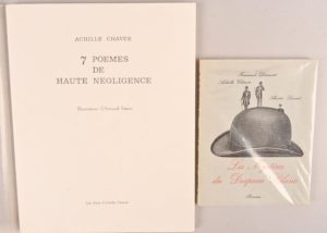 CHAVÉE Achille CHAVÉE Achille 1/50 DE TÊTE 7 Poèmes de haute négligence La Louvière, Les Amis d’Achille Chavée, 1975 Grand in-4°, broché. Très frais. Édition originale posthume avec de très belles illustrations à pleine page d’Armand Simon. 1/50 de tête sur Fioretti antica (n°VIII) On joint : CHAVÉE Achille – DUMONT Fernand – LORENT André Les Mystères du drapeau blanc La Louvière, Le Daily-Bul, 1979 In-12°, broché. Édition originale tirée à 1000 exemplaires.