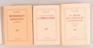 CLAUDEL Paul CLAUDEL Paul Réunion de 3 œuvres en édition originale sur grand papier : - Mémoires improvisés recueillis par Jean Amrouche Paris, Gallimard, NRF, 1954 In-8°, broché. Couv. et dos passés Édition originale. 1/36 exemplaires de tête sur Hollande. - Paul Claudel interroge l’Apocalypse Paris, Gallimard, NRF, 1952 In-8°, broché. Édition originale. 1/110 exemplaires de tête sur pur fil, après 15 Hollande. - Au milieu des vitraux de l’Apocalypse Paris, Gallimard, NRF, 1966 In-8°, broché. Édition originale. 1/89 exemplaires de tête sur pur fil, après 29 Hollande.