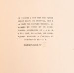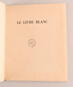 [COCTEAU Jean] [COCTEAU Jean] RARISSIME ÉDITION ORIGINALE AVEC PHOTOGRAPHIE ORIGINALE Le Livre blanc Paris, [Maurice Sachs et Jacques Bonjean], Imp. Ducros et Colas, 1928 In-4°. Plein papier chiffon à la cuve à la bradel décoré d’étoiles « à la Cocteau » émeraude et d’argent. Gardes de même papier. Dos orné d’une pièce de maroquin vert avec titre en lettres dorées. Tête dorée. Couv. et dos cons d’une très belle fraîcheur. Frott. aux coins et coiffes sans excès. Intérieur parfait. Très rare édition originale tirée à seulement 31 exemplaires sur vergé blanc de Montval, fait à la main par Gaspard Maillol ; ici, 1/10 réservés à l’auteur (n°IX). Est montée en guise de frontispice une photographie originale de Jean Roubier (tirage gélatino-argentique 23,5x18,5) : « Jean Cocteau au masque et à la main » [1935], protégée par une serpente. Très importante œuvre de Cocteau, publiée anonymement, dans laquelle il traite sans détours de son homosexualité. Une édition illustrée de dessins de Cocteau suivit celle-ci deux ans plus tard. D’une très grande rareté !
