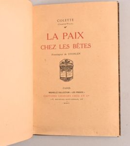 COLETTE (COLETTE WILLY) COLETTE (COLETTE WILLY) 1/10 DE TÊTE SUR CHINE La Paix chez les bêtes Paris, Georges Crès et Cie, 1916 In-8°. Demi-maroquin marron à la bradel. Dos lisse avec auteur, titre te t date en lettres dorées. Couv. et dos cons. Édition originale. 1/10 exemplaires de tête sur Chine (n°7). Complet du frontispice par Steinlen.