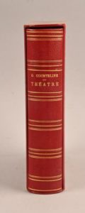 COURTELINE Georges COURTELINE Georges Réunion de 9 scènes, saynètes ou vaudevilles, la plupart en édition originale in-12°, tous brochés, réunis sous chemise en demi-maroquin rouge au dos orné et étui bordé de même maroquin : - Gros Chagrins Paris, Stock, 1898 Envoi autographe signé de l’auteur - La Cinquantaine Paris, Librairie du Carillon, 1895 - La Peur des coups Paris, Charpentier et Fasquelle, 1895 - Les Balances Paris, Flammarion, sd [1901] - Le Droit aux étrennes Paris, Charpentier et Fasquelle, 1896 - Monsieur Badin Paris, Ollendorff, 1897 - Lidoire Paris, Flammarion, sd - Une Lettre chargée Paris, Stock, 1898 - L’Article 330 Paris, Stock, 1901 On joint du même : La Vie de caserne Paris, Émile Testard, 1896 Grand in-8°. Demi-maroquin rouge à coins (Ott rel.). Dos lisse richement orné de volutes, de palmes et d’arabesques dorées et d’un drapeau français mosaïqué. Pièce de maroquin vert avec auteur et titre en lettres dorées. Filets dorés ornant les plats. Tête dorée. Couv. et dos cons. Petits frott. aux coins. Édition originale illustrée de 41 compositions de Henri-Louis Dupray, dont 2 en couleurs sur la couverture, 33 en noir dans le texte et 6 hors texte gravées en couleurs par Massé. 1/1000 exemplaires sur vélin du Marais. Provenance : Bibliothèque Louis de Sadeleer (ex-libris) – Bibliothèque Jean Jacobs (ex-libris) – Bibliothèque Armand Sibien (ex-libris)