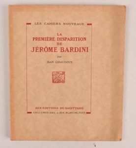 GIRAUDOUX Jean GIRAUDOUX Jean 1/50 SUR JAPON La Première Disparition de Jérôme Bardini Paris, Éditions du Sagittaire, chez Simon Kra, 1926 In-12° carré à grandes marges, broché. Couv. rempl. Trace fantôme de bibliothèque aux couv. Non coupé. Édition originale. 1/50 de tête sur Japon. Bel exemplaire.