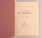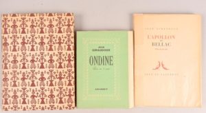 GIRAUDOUX Jean GIRAUDOUX Jean Réunion de 3 pièces de théâtre majeures de l’auteur en édition originale sur grand papier : - Ondine – pièce en 3 actes Paris, Grasset, 1939 In-12°, broché. 1/52 exemplaires sur pur fil Lafuma. - La Folle de Chaillot – pièce en deux actes Neuchâtel et Paris, Ides et Calendes, 1945 In-8°. Plein papier à motifs africanistes stylisés à la bradel. Dos orné d’une pièce de maroquin chocolat avec auteur et titre en lettres dorées. Tête dorée. Non rogné. Couv. et dos cons. 1/100 exemplaires sur Ingres Guarro, 2e grand papier après 13 Hollande - L’Apollon de Bellac -pièce en un acte Neuchâtel et Paris, Ides et Calendes, 1946 In-8°, broché. 1/100 exemplaires sur vergé chiffon de luxe, 2e grand papier après 13 Ingres Guarro.