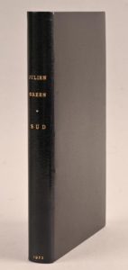 GREEN Julien GREEN Julien 1/35 DE TÊTE SUR JAPON - RELIURE DE MICHELINE DE BELLEFROID Sud – pièce en trois actes Paris, Plon, 1953 In-8°. Plein maroquin janséniste noir à larges grains (M. de Bellefroid). Dos lisse avec auteur, titre et date en lettres dorées. Doublures de box taupé bord à bord. Gardes de même box. Doubles gardes de papier kromekote aux tons noir, crème et gris avec des nuances de bleu. Coiffes guillochées. Filet doré courant sur les plats. Toutes tranches dorées. Couv. et dos parfaitement cons. Étui bordé de maroquin noir recouvert de papier kromekote identique aux doubles gardes. Édition originale illustrée de 4 gravures par Charles Shoup. 1/35 exemplaires de tête sur Japon impérial (n°J.8). Exemplaire très pur parfaitement établi.