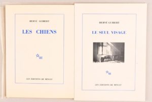 GUIBERT Hervé GUIBERT Hervé Réunion de 2 titres en édition originale : - Les Chiens Paris, Éditions de Minuit, 1982 In-12°, broché. Édition originale tirée à 1000 exemplaires (n°20) sur Bouffant - Le Seul Visage Paris, Éditions de Minuit, 1984 In-12°, broché. Édition originale dont il n’a pas été tiré de grand papier. Livre de photographies de Guibert qui a été publié à l’occasion de l’exposition qui s’était tenu de septembre à novembre 1984 à la galerie Agathe Gaillard, à Paris. Envoi autographe signé de l’auteur photographe.