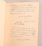 GUILLOUX Louis GUILLOUX Louis 1/18 DE TÊTE SUR HOLLANDE Le Jeu de patience Paris, Gallimard, NRF, 1949 Fort in-8°, broché. Petites déchirures en bordure du 1er plat et qqes rousseurs. Édition originale. 1/18 exemplaires de tête sur vélin de Hollande blanc. Double envoi autographe signé dont le 1er à Camille Bloch.