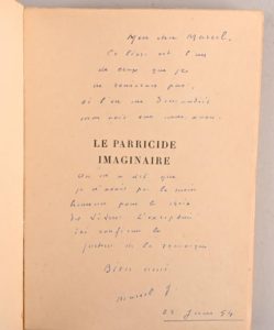 JOUHANDEAU Marcel JOUHANDEAU Marcel 1/100 HC SUR JAPON Le Parricide imaginaire Paris, Éditions de la Pléiade, J. Schiffrin, [1930] In-8°, broché Édition originale. 1/100 HC sur Japon ; parmi eux, exemplaire imprimé spécialement pour Alfred Fabre-Luce Long et très touchant envoi autographe daté (23 juin 1954) et signé de l’auteur à un certain Marcel. On joint du même le même titre mais exemplaire de « remise en vente » avec une nouvelle couverture de la NRF et une vignette au nom de la NRF contrecollée sur celui de l’éditeur initial en p. de titre. Dos bruni et 1er cahier presque débroché. 1/60 exemplaires sur Hollande. Envoi autographe signé de l’auteur au bibliophile belge Georges Donckier de Donceel