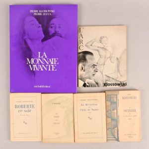 KLOSSOWSKI Pierre KLOSSOWSKI Pierre La Révocation de l’Édit de Nantes Paris, Les Éditions de Minuit, 1959 In-12°, broché. Édition originale. 1/1500 sur vélin supérieur, après 37 sur pur fil du Marais. On joint du même : - Roberte ce soir Paris, Les Éditions de Minuit, 1953 (1959) In-12°, broché. Premier retirage de cette édition illustrée hors texte de 6 compositions de Klossowski. 1/1000 exemplaires sur vélin supérieur. - Le Bain de Diane Paris, Jean-Jacques Pauvert, 1956 In-12°, broché. Édition originale. Tirage à 2000 exemplaires (n°280) - Le Souffleur ou le théâtre de société Paris, Jean-Jacques Pauvert, 1960 In-12°, broché. Édition originale dont il n’a pas été tiré de grand papier. - La Monnaie vivante Paris, Éric Losfeld, 1970 In-folio. Cartonnage illustré d’éditeur. Édition originale. Textes et dessins de l’auteur. Photographies de Pierre Zucca. - [Revue] L’Arc N°43, 1970 In-8°, broché. Numéro consacré à Pierre Klossowski.
