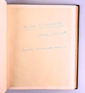 LACRETELLE Jacques de LACRETELLE Jacques de MANUSCRIT AUTOGRAPHE COMPLET Dix jours à Ermenonville (premier manuscrit) – Ermenonville 15 janvier – 25 février 1925 In-folio carré. Plein maroquin noir à larges grains (Canape). Dos à 5 nerfs avec auteur, titre et lettres MS [pour Manuscrit] en lettres dorées. 5 filets dorés entourant les bordures de même maroquin des contreplats. Tête dorée. Petites griffures et un coin frotté. 89 ff. recto manuscrits numérotés, rédigés sur papier crème à l’encre bleue, collés en marge de gauche sur papier vergé (qqes rousseurs sur le papier vergé). Les 33 premiers ff. sont constitués de notes préparatoires et de brouillons où l’on perçoit la construction de l’œuvre en devenir. Le premier manuscrit, comme l’indique l’auteur lui-même, s’étend sur les 59 autres ff. On y trouve énormément de corrections, de ratures et d’ajouts parfois au verso des ff. L’ouvrage parut à Paris chez Chamontin en 1926. Très intéressant et rare manuscrit.
