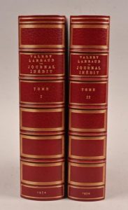 LARBAUD Valéry LARBAUD Valéry 1/56 DE TÊTE SUR ARCHES Journal inédit Paris, Gallimard, NRF, 1954, 2 tomes Grand in-8°. Demi-maroquin bordeaux à coins (Tchékéroul). Dos à 5 nerfs ornés d’un filet doré, décoré de caissons dorés, avec auteur, titre, tomaison et date en lettres dorées. Filets dorés ornant les plats. Tête dorée. Couv. et dos parfaitement cons. Étui bordé du même maroquin. Édition originale constituant les tome 9 et 10 des Œuvres complètes de l’auteur parues chez Gallimard. 1/56 exemplaires de tête sur Arches (n°35) Très élégant exemplaire.