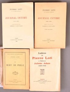 LOTI Pierre LOTI Pierre Lettres de Pierre Loti à Madame Juliette Adam (1880-1922) Paris, Plon, 1924 In-12°, broché Édition originale. 1/50 exemplaires sur Madagascar réservés au journal « Le Figaro ». On joint du même : - Journal intime Paris, Calmann-Lévy, 1926-30, 2 tomes In-12°, broché. Rousseurs au tome 1 et fente en queue du mors du 1er plat du tome 2. Édition originale. Ex. sur vélin du Marais. - La Mort de Philae Paris, Calmann-Lévy, [1908] In-12°, broché. Petits défauts aux coiffes. Édition originale sur papier d’édition.