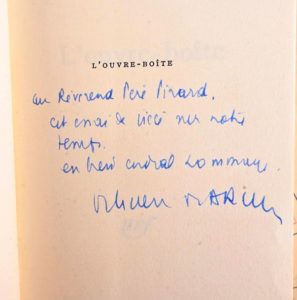 MARCEAU Félicien MARCEAU Félicien Réunion de 11 œuvres en édition originale, certaines sur grand papier, d’autres du SP avec envoi : - Chasseneuil Paris, Presses de la Cité, 1948 In-12°, broché. Ex. du tirage courant. - Casanova ou l’anti-Don Juan Paris, Presses de la Cité, 1948 Petit in-12°, broché. Pas de grand papier. - Chair et Cuir Paris, Presses de la Cité, 1948 In-12°, broché. Pas de grand papier. Cachets de bibliothèque. - Capri petite île Paris, Gallimard, NRF, 1951 In-12°, broché. 1/53 exemplaires sur vélin pur fil, seul grand papier - L’Homme du roi Paris, Gallimard, NRF, 1952 In-12°, broché. Ex. du service de presse. Envoi autographe signé de l’auteur à Marcel Lobet, journaliste et écrivain belge. Est encarté le f. de présentation du livre. - Bergère légère Paris, Gallimard, NRF, 1953 In-12°, broché. 1/45 exemplaires sur vélin pur fil, seul grand papier (1/5 HC) - En de secrètes noces Paris, Calmann-Lévy, 1953 In-12°, broché. Pas de grand papier. - Les Élans du cœur Paris, Gallimard, NRF, 1955 In-12°, broché. Ex. du service de presse. Envoi autographe signé de l’auteur au R. P. Pirard, critique littéraire. - Les Années courtes Paris, Gallimard, NRF, 1968 In-8°, broché. 1/60 exemplaires sur pur fil, seul grand papier. - Creezy Paris, Gallimard, NRF, 1969 In-12°, broché. Ex. du service de presse. Envoi autographe signé de l’auteur au R. P. Pirard, critique littéraire. Prix Goncourt 1969. - L’Ouvre-boîte Paris, Gallimard, NRF, 1972 In-12°, broché. Ex. du service de presse. Envoi autographe signé de l’auteur au R. P. Pirard, critique littéraire.