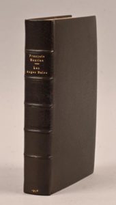 MAURIAC François MAURIAC François EXEMPLAIRE N°1 SUR JAPON NACRÉ Les Anges noirs Paris, Grasset, 1936 In-12°. Plein maroquin noir janséniste (Devauchelle). Dos à 5 nerfs avec auteur, titre et date en lettres dorées. Doublures de peau de vélin bordée de maroquin noir et d’un filet doré. Gardes de même peau. Doubles et triples gardes de Japon nacré. Toutes tranches dorées. Couv. et dos parfaitement cons. Étui signé Devauchelle, bordé de même maroquin noir et recouvert de papier aux tons brun et or. Édition originale de ce roman important de l’auteur. 1/11 exemplaires de tête sur Japon nacré (n°1). Provenance : Bibliothèque Raoul Simonson (ex-libris) Parfaitement établi.