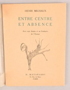 MICHAUX Henri MICHAUX Henri 1/15 SUR JAPON Entre Centre et Absence Paris, Henri Matarasso, 1936 In-12° carré, broché. Édition originale illustrée de 7 dessins et un frontispice de l’auteur. 1/15 de tête sur Japon (n°16) avec signature autographe de l’éditeur, après 5 Chine. Exemplaire d’une grande fraîcheur.