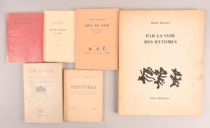 MICHAUX Henri MICHAUX Henri Qui je fus Paris, Gallimard, NRF, 1927 In-12°, broché. Rousseurs. Édition originale illustré d’un portrait de l’auteur par Aubert. 1/500 exemplaires. Provenance : Bibliothèque Mélot du Dy (ex-libris illustré). On joint du même ou à propos du même : - Quand tombent les toits Paris, GLM, 1974 Petit in-12°, broché. Non coupé. Édition originale. 1/1150 sur vergé Conqueror - Poteaux d’angle Paris, L’Envers/L’Herne, 1971 In-16°, broché. Non coupé. Édition originale. 1/125 de tête sur Ingres, après 25 Hollande. - Peintures – Sept poèmes et seize illustrations Paris, GLM, 1939. Petit in-12° carré. Édition originale. 1/550 sur vélin blanc. - Par la voie des rythmes Montpellier, Fata Morgana, 1974 In-folio, broché. Couv. avec taches et rousseurs, dos insolé, 1er mors fendu. Ex-dono en p. de garde. Édition originale sur papier d’édition illustrée de 82 dessins reproduits de l’auteur. - Raymond Bellour Henri Michaux ou une mesure de l’être Paris, Gallimard, NRF, Les Essais, 1965 In-12°, broché. Édition originale. Exemplaire du Service de presse avec envoi autographe signé de l’auteur.