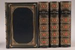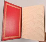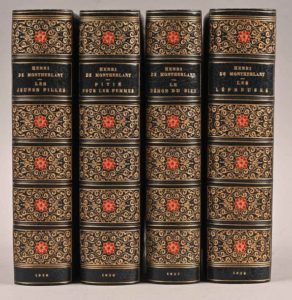 MONTHERLANT Henry de MONTHERLANT Henry de RELIURES DE GEORGES HUSER –EXEMPLAIRES DE TÊTE SUR JAPON NACRÉ Cycle des « Jeunes filles » au complet paru chez Grasset : - Les Jeunes filles, 1936 - Pitié pour les femmes, 1936 - Le Démon du bien, 1937 - Les Lépreuses, 1939 In-12°. Plein maroquin bleu nuit mosaïqué (Huser). Dos à 5 nerfs ornés d’un filet doré, décoré de caissons dorés richement habillés de volutes et d’arabesques dorées ainsi que de fleurs stylisées mosaïquées de maroquin rouge. Auteur, titre et date en lettres dorées. Jeux de filets dorés sur les plats avec en écoinçons internes, arabesques dorées et fleurs stylisées mosaïquées de maroquin rouge, et en écoinçons externes, feuilles d’acanthe dorées. Doublures de maroquin rouge ornées de 7 sept filets dorés, bordées de maroquin bleu nuit et entourées d’un filet doré. Gardes de moire écrue décorée de feuilles d’acanthe beiges et de guirlandes de fleurs d’argent. Coiffes guillochées. Double filet doré courant sur les coupes. Toutes tranches dorées. Couv. et dos parfaitement cons. Chemise à 5 faux-nerfs à rabats et dos de maroquin bleu nuit avec auteur et titre en lettres dorées, doublée de peau de vélin. Étui bordé de même maroquin. Rares frott. au dos de 2 chemises. Pour chaque volume, édition originale. 1/10 exemplaires de tête sur Japon nacré (n°5) pour les trois premiers volumes, 1/13 exemplaires de tête sur Japon nacré (n°2) pour le 4e. Provenance : Bibliothèque José Péraya (ex-libris) Superbes exemplaires parfaitement établis par Huser.