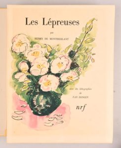 MONTHERLANT Henry de de – [VAN DONGEN Kees] MONTHERLANT Henry de de – [VAN DONGEN Kees] Les Lépreuses Paris, Gallimard, NRF, 1947 Grand in-4° en ff. Sous chemise et étui d’éditeur. Édition illustrée de 25 lithographies en couleurs par Van Dongen. Tirage à 390 exemplaires. 1/354 sur vélin de Rives. Très bel exemplaire