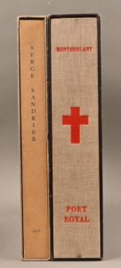 MONTHERLANT Henry de MONTHERLANT Henry de Réunion de 2 œuvres illustrées en édition originale : - Port-Royal Paris, Henri Lefebvre, 1954 Grand in-4° en ff. sous chemise et étui d’éditeur. Ouvrage orné de 12 lithographies originales de René Aubert (dont un frontispice). Tirage à 250 exemplaires sur Arches ; parmi eux, 1/20 de tête (n°6) contenant, outre les 12 lithographies originales, une suite sur Chine, une suite sur Arches et un dessin original. Bel envoi autographe signé de l’auteur au Docteur Duménil. - Serge Sandrier Paris, Droin, 1948 Grand in-4° en ff. sous chemise et étui d’éditeur. Ouvrage illustré de 11 eaux-fortes de Mariette Lydis (dont un frontispice). Tirage à 262 exemplaires sur Rives ; parmi eux, I/XII pour l’exportation (n°J).