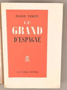 NIMIER Roger NIMIER Roger 1/37 DE TÊTE SUR PUR FIL Le Grand d’Espagne Paris, La Table Ronde, 1950 In-12°, broché. Non coupé. Partie de la coiffe de queue un peu brunie, sinon exemplaire très frais. Édition originale. 1/37 exemplaires de tête sur pur fil (n°17).