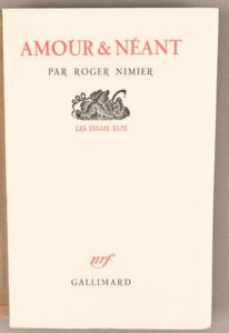 NIMIER Roger NIMIER Roger 1/58 DE TÊTE SUR PUR FIL Amour & Néant Paris, Gallimard, NRF, Les Essais, 1951 In-12°, broché. Non coupé. Édition originale. 1/58 exemplaires de tête sur pur fil (n°55). Exemplaire très frais.